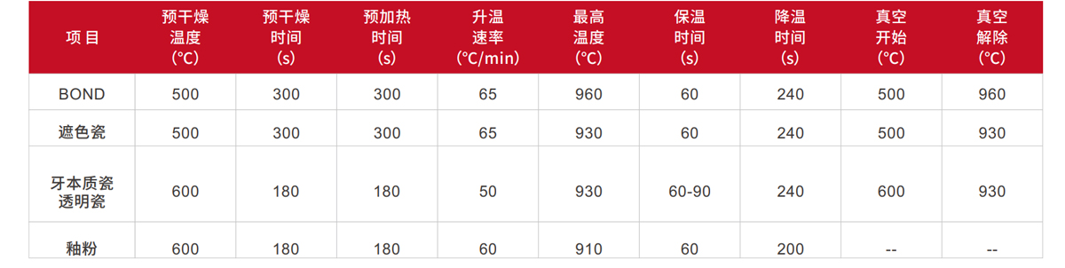 以上操作參數(shù)對使用者只是參考,如果燒結(jié)后的修復(fù)體表面特征,透性及光亮程度與理想狀態(tài)不一致,必須調(diào)整相應(yīng)的燒結(jié)程序。燒結(jié)程序的決定因素不是烤瓷爐的顯示溫度,而是燒結(jié)對象燒結(jié)后的外觀及表面特性。